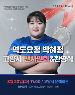 (서울=NSP통신) 강은태 기자 = 고양특례시(시장 이동환)는 오는 20일 오전 11시 고양시청 문예회관에서 박혜정 선수의 파리올림픽 여자역도 최중량급 은메달 획득을 축하하는 팬사인회와 환영식을 개최한다.