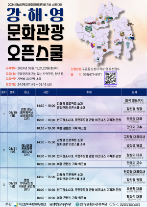 오픈스쿨은 19일 강진을 시작으로 21일에는 해남에서 실시되고 마지막으로 23일에는 영암에서 개최될 예정이다. 세 지역에서 강해영 프로젝트에 대한 이해를 높이고 지역주민과 청년들에게 문화관광 비즈니스 발굴 및 참여기회를 제공하는 것이 주요 내용이다.