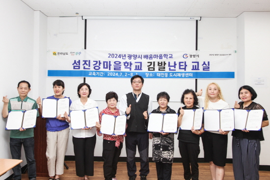 (전남=NSP통신) 김성철 기자 = 광양시는 지난 1일 2024년 전라남도 평생교육 활성화 배움마을학교 사업의 첫 번째 프로그램으로 진행한 ‘김발난타 교실’ 수료식이 섬진강마을학교(교장 김대성)에서 개최됐다고 알렸다.