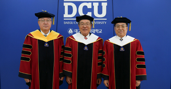 대구가톨릭대 이순신학과 박사학위를 받은 윤동한 회장이 기념 촬영을 하고 있다. 사진 왼쪽부터 김기홍 일반대학원장, 윤동한 회장, 성한기 총장 (사진 = 대구가톨릭대학교)