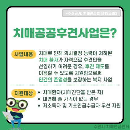 ‘치매 공공후견사업’은 치매 진단을 받은 환자 중에서 권리를 대변해 줄 가족이 없는 치매 환자들이 후견인의 도움을 받아 안정적인 삶을 영위할 수 있도록 지원하는 것이다.