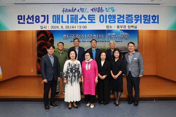 안동시는 28일 시청 청백실에서 매니페스토 이행검증위원회를 열고 민선 8기 2년간의 공약 이행상황을 평가했으며, 이날 회의에는 공약 관련 전문가, 학자, 사회단체 대표, 주민 위원 등 매니페스토 이행검증위원회 위원 9명이 참석해 검증에 나섰다.