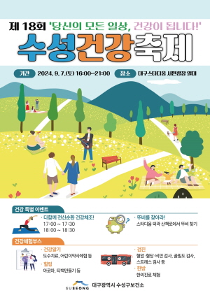 (경북=NSP통신) 김대원 기자 = 대구 수성구(구청장 김대권)는 오는 9월 7일 대구스타디움 서편광장 일대에서 ‘제18회 수성건강축제’ 를 개최한다.