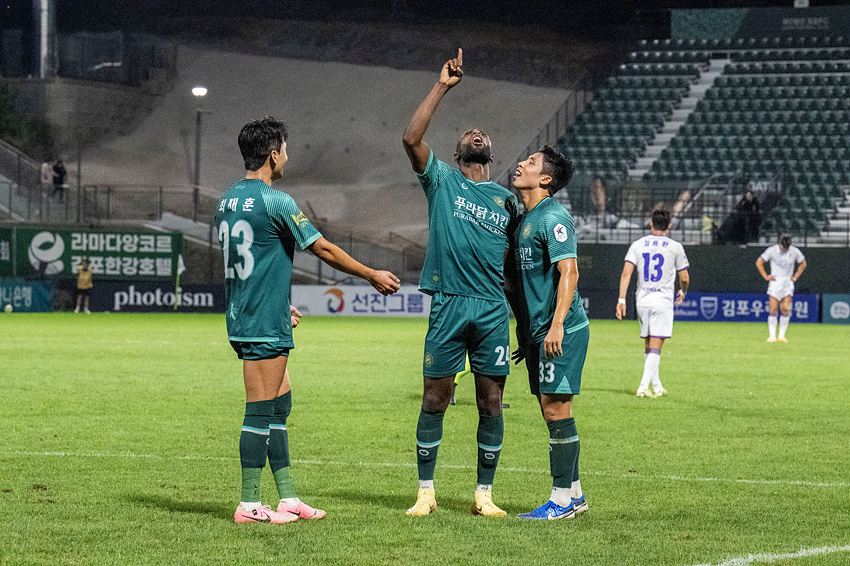 (경기=NSP통신) 조이호 기자 = 경기 김포FC(구단주 김병수)가 K리그2 2위 팀 전남드레곤즈를 상대로 승리를 거두며 숨 막히는 순위싸움을 이어갔다.