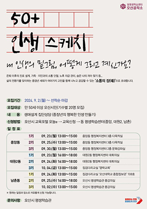 ‘50+ 인생스케치’는 2024년 ‘동 평생학습센터’로 선정된 중앙동, 대원2동, 남촌동을 거점으로 운영되는 생애설계상담 프로그램이다.