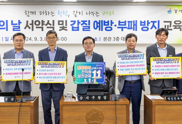 (서울=NSP통신) 강은태 기자 = 서울시 강서구(구청장 진교훈)는 3일 오후 구청 대회의실에서 5급 이상 간부 공무원 전원이 참석한 가운데 ‘전 직원 실천과제 11 서약식’을 개최했다고 4일 밝혔다.