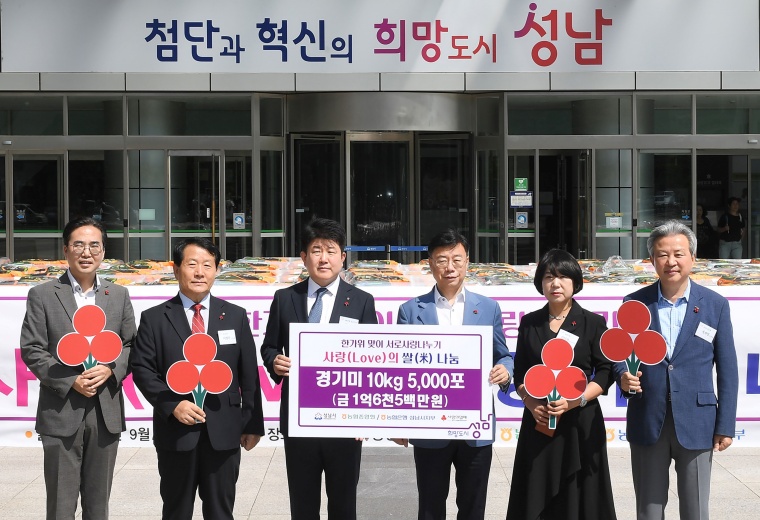 시는 이날 오전 11시 시청 광장에서 신상진 성남시장과 양흥식 농협 성남시지부장 등이 참석한 가운데 ‘2024년 한가위 맞이 서로 사랑 나누기 쌀 전달식’을 했다.