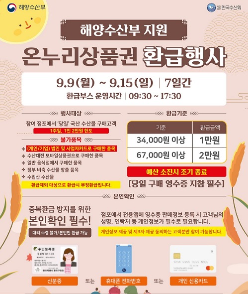 먼저 해양수산부에서 1인당 최대 2만 원 한도로 구매금액에 따라 온누리상품권을 환급하는 행사를 오는 9일부터 15일까지 진행한다.