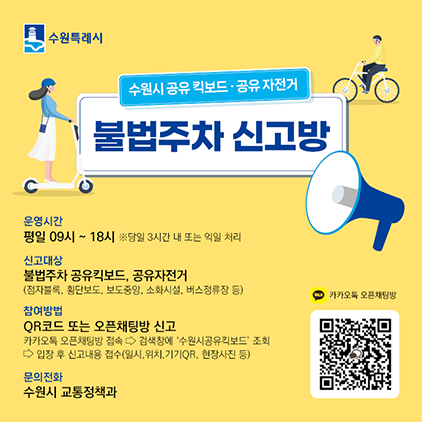 카카오톡 오픈채팅 메뉴에서 ‘수원시공유킥보드’를 검색하거나 홍보물에 첨부된 QR코드를 스캔해 신고방에 입장할 수 있다. 채팅으로 발생일시, 장소, 내용, 현장 사진 등을 첨부해 신고하면 된다.