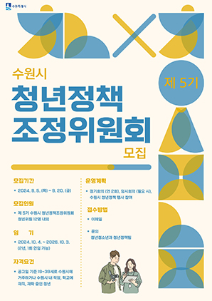 (경기=NSP통신) 조현철 기자 = 경기 수원시(시장 이재준)가 오는 20일까지 제5기 수원시 청년정책조정위원회 청년 위원 모집한다.