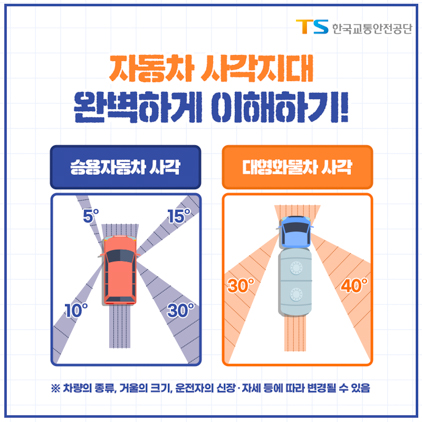 공단 실험에 따르면 2.5톤 화물자동차의 경우 전방 사각지대 1m(신장 1m 내외의 어린이 기준), 좌·우측 사각지대는 약 30~40도로 승용자동차보다 사각지대가 넓은 것으로 나타나 운전자의 각별한 주의가 필요하다.