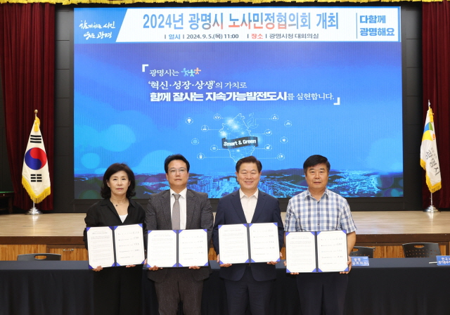 (경기=NSP통신) 김여울 기자 = 경기 광명시(시장 박승원)는 5일 시청 대회의실에서 광명시 노사민정협의회를 열어 지속가능한 자족도시로의 대전환을 이루기 위한 노사민정 공동선언을 선포하고 협력을 다짐했다.