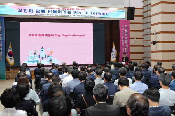 (경북=NSP통신) 조인호 기자 = 포항시는 5일 시청 대회의실에서 간부 공무원 100여 명을 대상으로 고병철 포스텍홀딩스 대표이사를 초청해 ‘포항과 함께 만들어 가는 Pay-It-Forward’ 라는 주제로 조찬포럼을 개최했다.