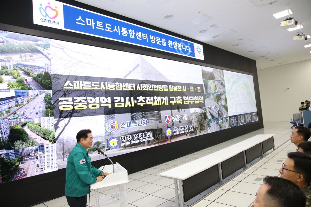 NSP통신-8월 안양시가 수도군단 및 경찰서와 스마트도시통합센터 CCTV 등의 시설을 공유해 공중영역 감시 및 추적체계를 구축하는 업무협약을 체결했다. (사진 = 안양시)