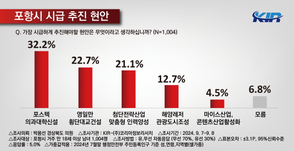 이번 조사는 ‘코리아정보리서치(KIR)’가 지난 9월 7일~8일 2일간 포항시에 거주하는 만 18세 이상의 성인 남녀를 대상으로 유·무선전화 RDD(무작위 전화 면접방식)를 활용한 자동응답시스템(ARS)을 사용했으며, 총 1004명이 응답한 조사의 표본오차는 95% 신뢰수준에서 오차범위 ±3.1%P, 응답률은 5%였다.