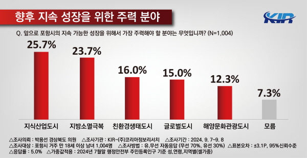 또 앞으로 포항시의 지속가능한 성장을 위해 가장 주력해야 할 분야로는 ‘고부가가치 신성장 산업을 선도하는 지식산업도시(25.7%)’, ‘균형발전 거점도시 조성을 통한 지방소멸 극복(23.7%)’, ‘탄소중립 기후변화 대응을 통한 친환경 생태도시(16.0%)’, ‘도시 경쟁력 강화를 통해 세계와 교류하는 글로벌 도시(15.0%)’, ‘365일 즐거움과 행복이 가득한 해양문화 관광 도시(12.3%)’, ‘잘 모르겠다(7.3%)’ 등으로 집계됐다.
