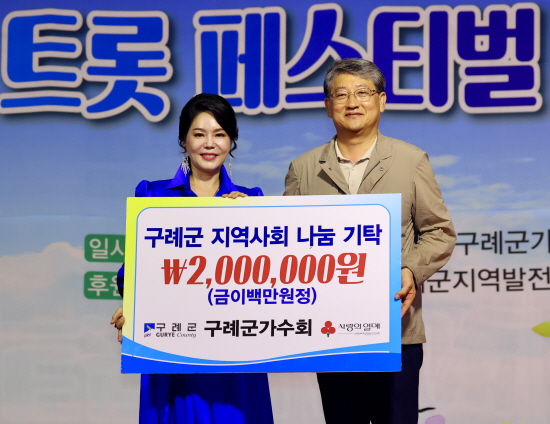 (전남=NSP통신) 김성철 기자 = 구례군은 지난 16일 열린 ‘2024 구례 트롯 페스티벌 및 읍·면 노래자랑’에서 구례군가수회(회장 이정옥)가 어려운 이웃을 위한 기부금 200만 원을 군에 전달했다고 밝혔다.