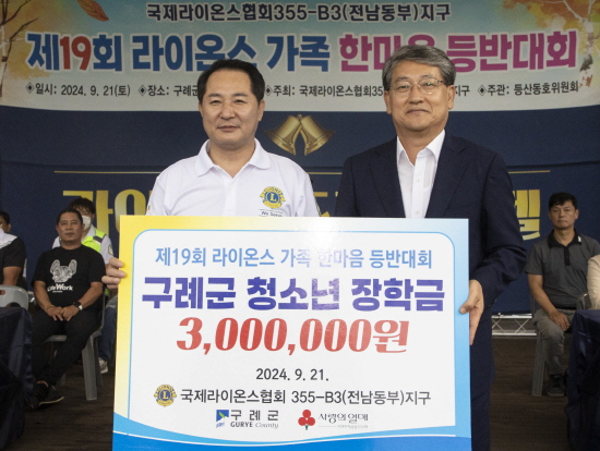 (전남=NSP통신) 김성철 기자 = 구례군은 국제라이온스협회 355-B3(전남동부)지구가 지난 21일 화엄사 일원에서 열린 제19회 라이온스 가족 한마음 등반대회에서 구례군 청소년들을 위한 장학금 300만 원을 기탁했다고 밝혔다.