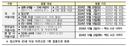 2024-2025절기 인플루엔자 국가예방접종 진행표 (표 = 광양시청)