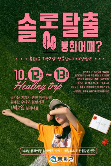 10월 12일부터 1박 2일간 열리는 ‘솔로탈출 봉화어때?’는 미혼 청춘남녀 각 20명이 참여해 봉화군의 매력적인 관광지인 정자문화생활관, 문수산자연휴양림, 분천산타마을 등 일원에서 랜드마크 투어 데이트, 커플 게임, 바비큐 파티 등 흥미로운 커플 매칭 프로그램을 통해 서로를 알아가는 시간을 갖는다.