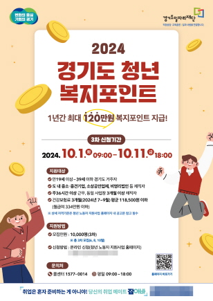 ‘청년 복지포인트’는 경기도 소재 중소․중견기업, 소상공인업체, 비영리법인에서 주 36시간 이상 근무하고 월 급여가 334만원 이하인 도내 거주 청년(만 19~39세)을 대상으로 연간 120만원 상당의 복지포인트를 지급하는 사업이다. 병역의무 이행자는 병역 기간만큼 신청 연령이 연장(최대 3년)된다.
