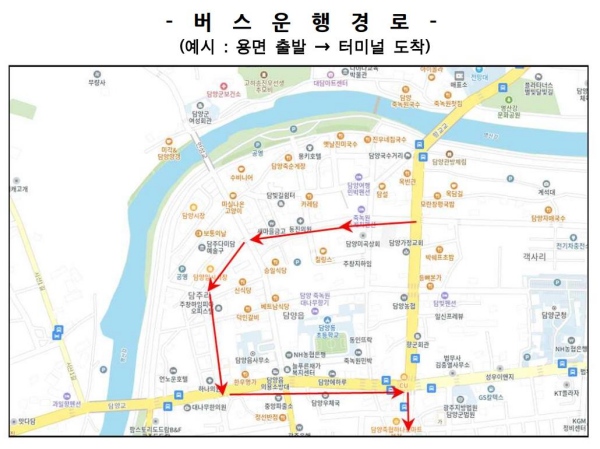 운행 노선은 금성면과 용면 2개이며, 운행경로는 향교교 입구 → 동진의원 → 담양임시시장 → 하나의원 방면 일방통행으로 오전 6회, 오후 4회 각각 운행한다.