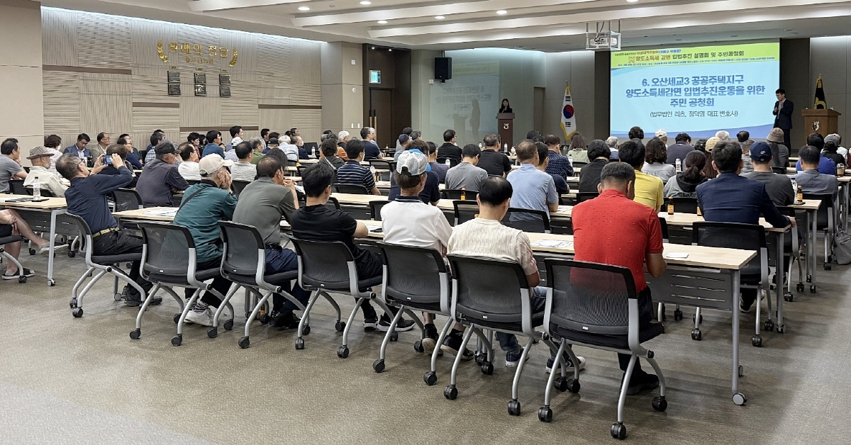 (경기=NSP통신) 김종식 기자 = 경기 오산세교3 공공주택지구 비상대책위원회(위원장 이봉구)는 28일 오전 오산농협 본점 3층 대강당에서 공공주택지구 토지주들이 450여 명이 참석한 가운데 공공주택지구 양도소득세 감면을 위한 주민공청회를 개최했다.
