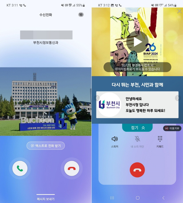 부천시 행정전화 스마트 레터링 서비스 전화 수신 화면. (이미지 = 부천시)