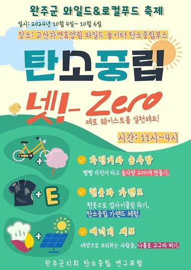 제12회 완주와일드&로컬푸드 축제를 맞아 ‘2050 탄소중립’을 주제로 진행되는 이번 행사는 완주군의회 탄소중립 의원연구단체(대표위원 심부건)가 선도적으로 주도하고 군민들이 함께하는 소통의 장으로 추진된다.