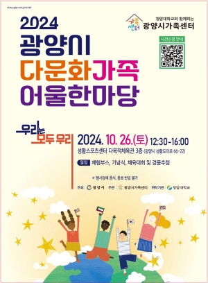 광양시는 다문화가족 간의 소통과 화합의 장을 제공하기 위해 광양시가족센터(센터장 손경화) 주관으로 매년 다문화가족 어울한마당 행사를 개최하고 있다. 올해 행사 주제는 ‘우리는 모두 우리’이며, 1부와 2부로 나눠 진행할 방침이다.