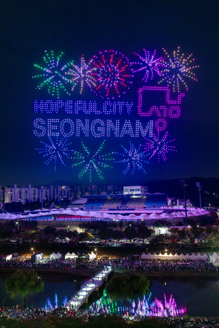 2024 성남페스티벌은 13일 저녁 세계 최초로 디즈니 캐릭터를 2200대라는 가장 많은 드론으로 성남의 하늘을 수놓으며 성대한 막을 내렸다. 탄천변을 가득 메운 시민들은 드론들이 새로운 캐릭터를 연출할 때마다 환호와 박수로 감동을 표현했다.