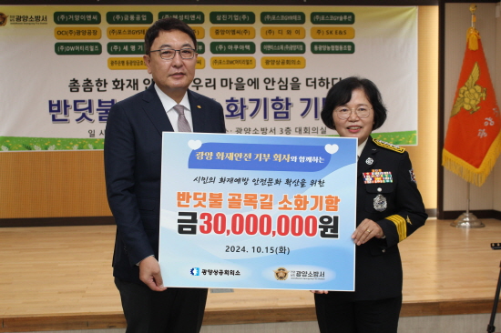 (전남=NSP통신) 김성철 기자 = 광양상공회의소(회장 우광일)는 광양소방서에 반딧불 골목길 소화기함 설치 사업비 3000만원을 기탁했다.
