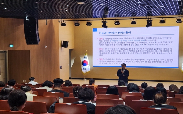 이번 연수는 유치원과 어린이집이 연계프로그램을 통해 유아들이 발달 단계에 맞는 교육을 받고 새로운 교육환경에 적응할 수 있도록 돕는 유·보 이음교육에 대한 이해도를 높이고 실제 운영 방안을 모색하기 위해 마련됐다.