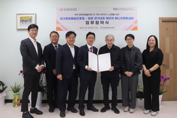 (경북=NSP통신) 김대원 기자 = 대구문화예술진흥원(원장 박순태)은 지난 15일 일본 코가네초 에리어 매니지먼트 센터(디렉터 야마노 신고)와 레지던시 국제 교류 활성화를 위한 업무협약을 체결했다.