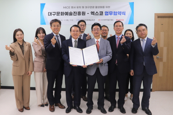 대구문화예술진흥원 관광본부는 엑스코와 MICE 행사(기업회의(Meeting)·포상관광(Incentive)·컨벤션(Convention)·전시(Exhibition)) 유치 및 대구 문화관광 활성화를 위한 업무협약(MOU)을 17일 체결했다. (사진 = 대구문화예술진흥원)