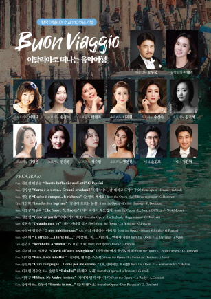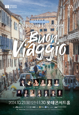 서울 롯데콘서트홀에서 21일 오전 11시 30분 열리는 제73회 이탈리아성악회 정기연주회 ‘이탈리아로 떠나는 즐거운 음악여행 (Buon Viaggio)’은 로시니, 도니체티, 베르디 등 이탈리아의 대표적인 작곡가를 비롯해 모차르트와 카탈리니에 이르기까지 많은 세계적인 작곡가들의 아름다운 오페라 아리아를 선보일 예정이다.