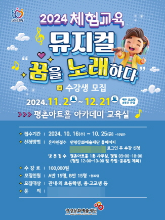 교육은 11월부터 12월까지 8주간 매주 토요일마다 진행되며 A반은 10시부터 11시 30분까지, B반은 11시 30분부터 오후 1시까지 90분간 진행된다. 정원은 각 반마다 15명이며 수강 신청은 오는 25일까지 안양문화예술재단 홈페이지 및 평촌아트홀 현장에서 접수할 수 있다. 수강료는 총 10만원이다.