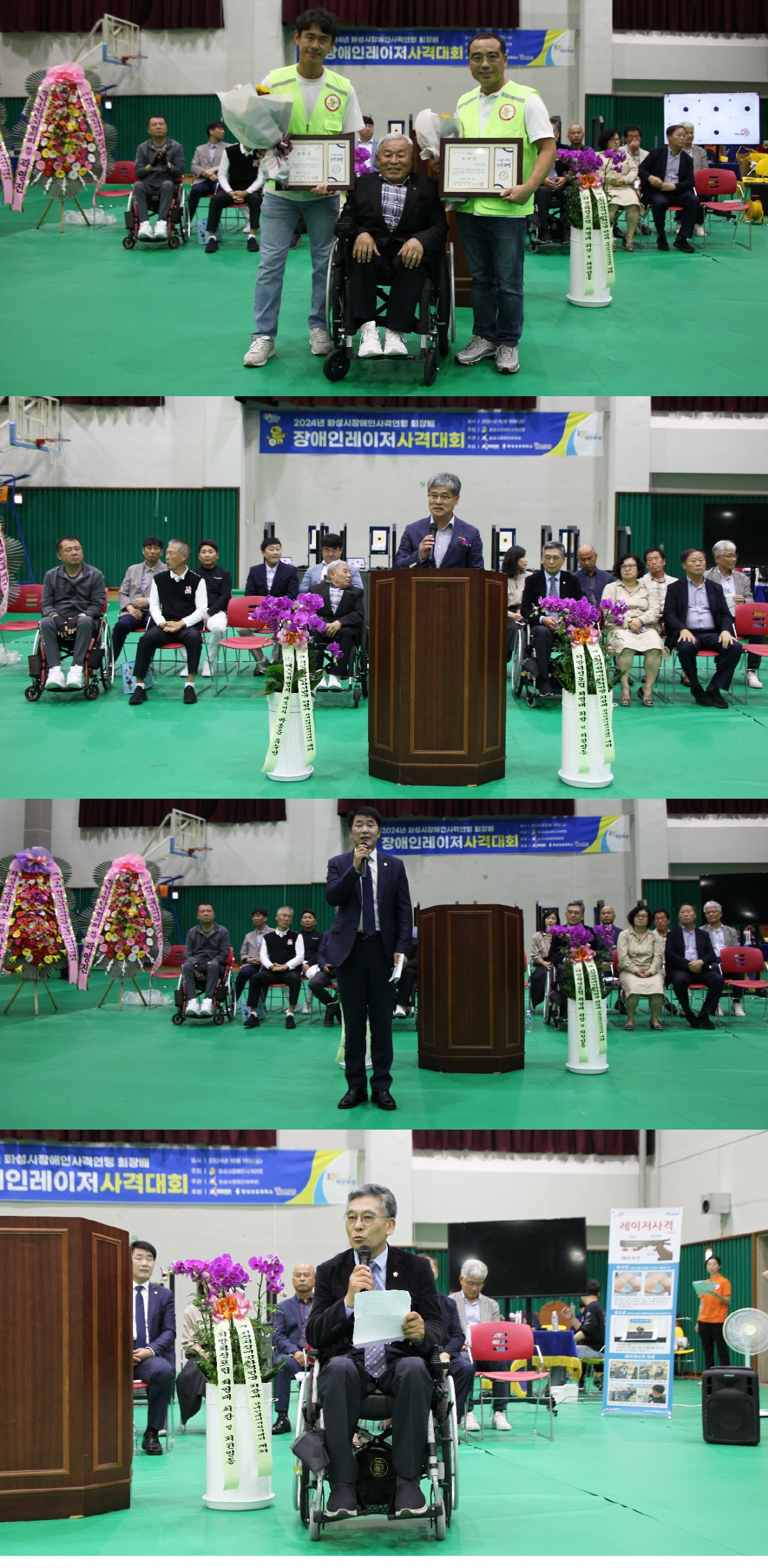 개회식에서 장세환, 양창원 화성시장애인사격연맹 이사가 정명근 화성시장에게 장애인 사격 발전에 기여한 공로로 표창장을 받았다.