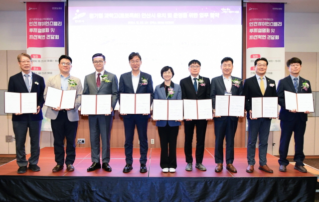 23일 고양 킨텍스에서 열린 경기형 과학고 안산시 유치 및 운영 업무협약식에서 이민근 안산시장(왼쪽 네번째)을 비롯한 관계자들이 기념촬영을 하고 있다. (사진 = 안산시)