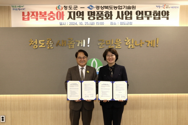 (경북=NSP통신) 김대원 기자 = 경상북도농업기술원(원장 조영숙)은 청도군(군수 김하수)과 경북 복숭아 산업의 경쟁력 강화를 위해 지난 25일 청도군청에서 ‘납작복숭아 신품종 명품화 사업’ 추진을 위한 업무협약을 체결했다.