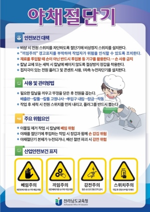 (전남=NSP통신) 김용재 기자 = 전남도교육청(교육감 김대중)이 도내 학교(기관)의 산업안전보건법령 의무이행 사항 준수 및 산업재해 예방을 위해 ‘산업안전보건법령 요지’와 ‘안전수칙’포스터를 제작해 배부했다.