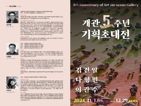 이번 전시는 김건일, 나형민, 이관수 세 작가의 오랜 작업이 담긴 작품 65점을 11월 1일부터 12월 29일까지 만나볼 수 있다. 개관 5주년 기념행사는 11월 13일 오후 5시에는 디오션 호텔 로비 1층 갤러리에서 진행된다.