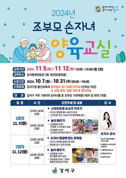 (서울=NSP통신) 강은태 기자 = 서울 강서구(구청장 진교훈)가 손자녀 양육에 어려움을 겪는 조부모들을 위해 ‘2024 조부모 손자녀 양육 교실’을 운영한다.