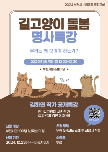(경기=NSP통신) 서국현 기자 = 경기 부천시(시장 조용익)는 11월 9일 오전 10시부터 부천 시청 소통마당에서 길고양이 인식 개선을 위한 명사 특강을 개최한다.