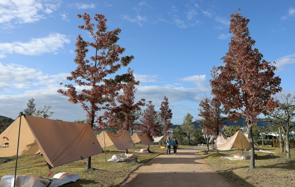 메인 행사장의 부스를 지나 오른편에 조성된 ‘힐링놀이터’는 하늘거리는 타프가 만들어내는 그늘 속 빈백에 누워 하염없이 ‘멍때리기’를 할 수 있는 공간과 누구나 이용할 수 있는 인디언 텐트를 조성해 여유를 더했으며, 통기타로 펼쳐지는 버스킹 공연과 함께 시선을 돌리면 대단지의 코스모스 꽃밭이 펼쳐져, 분주하고 활기찬 메인 행사장과는 확연히 구분되는 여유로운 분위기를 자아냈다.
