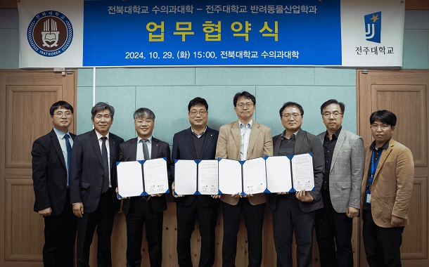 전북대 수의과대학에서 열린 이번 협약식은 전북대 수의과대학 박상열 학장과 김범석 부학장, 동물의료센터의 신기욱 센터장 그리고 전주대 반려동물산업학과 이승옥 학과장, 곽이구 기획처장 등 양 기관 관계자 8명이 참석한 가운데 진행됐다.