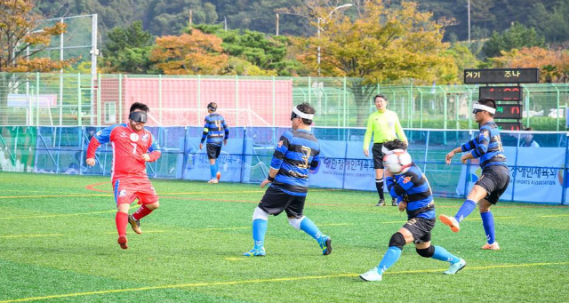 제44회 전국장애인체육대회에서 경기도장애인축구선수(시각)들이 경기 하는 모습. (사진 = 김종식 기자)