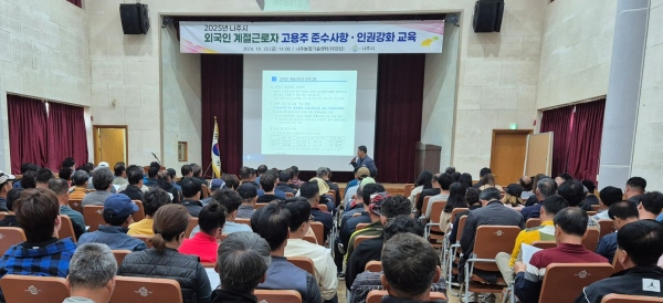 (전남=NSP통신) 김용재 기자 = 나주시(시장 윤병태)가 최근 나주시농업기술센터에서 외국인 계절근로자 고용농가 200명을 대상으로 고용주 준수사항 및 인권강화 교육을 실시했다.