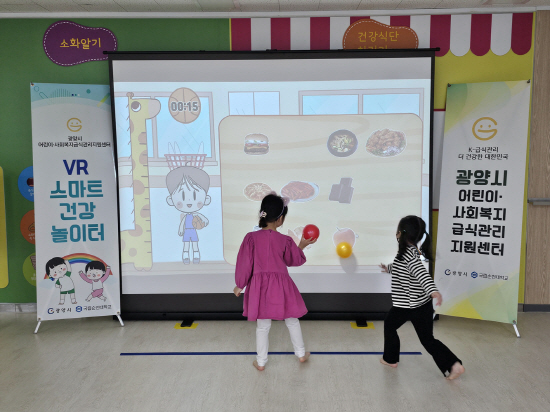 아침, 점심, 저녁에 해당하는 건강한 식품을 찾아보는 놀이형 편식 예방 교육은 광양시 어린이‧어린이사회복지급식관리지원센터 프로그램실에 비치된 가상 현실(VR) 체험 장비를 활용해 아이들의 참여도가 높았다.