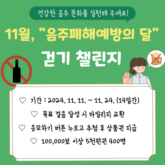서영옥 건강증진과장은 “광양시는 워크온을 통해 시민들의 생활 속 걷기를 장려하고 있다”며 “11월은 음주폐해예방의 달로 이번 챌린지를 통해 절주 문화가 확산되기를 바란다”고 말했다.